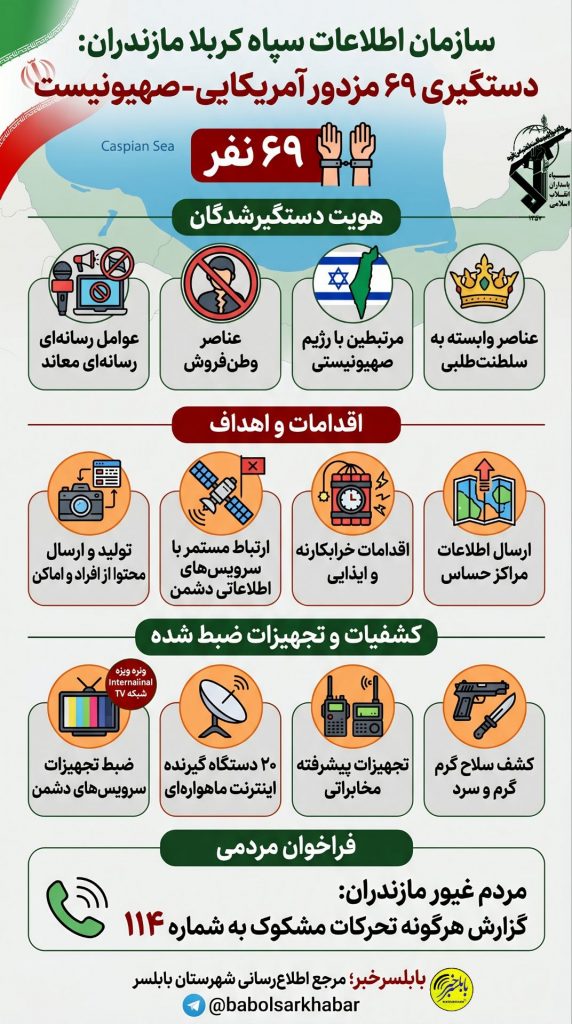 به گزارش پایگاه خبری بابلسرخبر،به اطلاع مردم بصیر، شریف و انقلابی استان مازندران می رساند؛با تلاش های سربازان گمنام امام زمان عج، در سازمان اطلاعات سپاه کربلا،۶۹ نفر در قالب عناصر وابسته به جریان سلطنتطلبی، مرتبطین با رژیم صهیونیستی، عناصر وطنفروش و عوامل رسانهای در سطح استان شناسایی و دستگیر شدند.